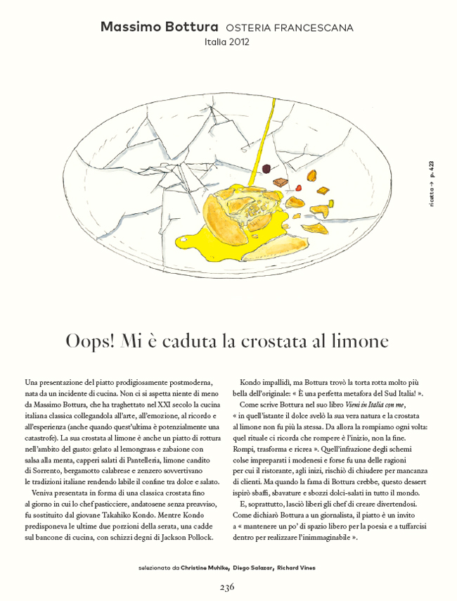 La risposta è in questo magnifico libro di oltre 400 pagine, che raccoglie e presenta i piatti più iconici, quelli più significativi, degli ultimi secoli: una collezione di ricette, che parte dai primissimi “ristoranti” della storia alle proposte innovative dell’attuale scena gastronomica. Si parte dal gelato (in realtà definibile piuttosto un sorbetto), “inventato” da Procopio Cutò, di Le Procope, considerato il primo caffé/ristorante della storia, passando attraverso la Pesca Melba di Auguste Escoffier al Savoy, per arrivare ai giorni nostri, a Gualtiero Marchesi, Joël Robuchon, Massimo Bottura, Ferran e Albert Adrià e alle tante ricette entrate nella storia.